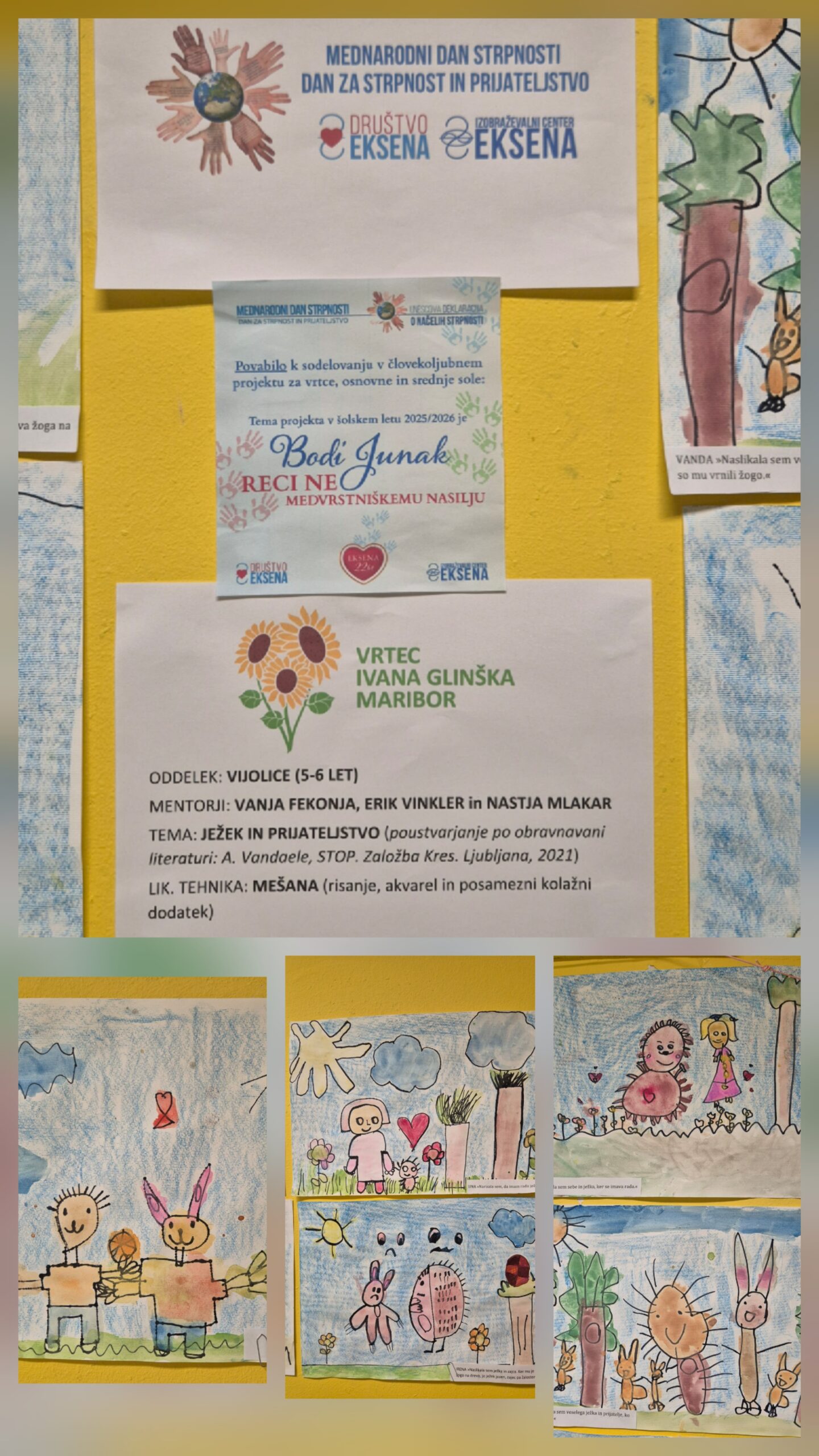 V Vrtcu Ivana Glinška Maribor sodelujemo v projektu Mednarodni dan za strpnost – dan za strpnost in prijateljstvo 2025/26 – obeležitev mednarodnega dneva strpnosti, 16. november. Tema letošnjega projekta je “BODI JUNAK – RECI NE MEDVRSTNIŠKEMU NASILJU”.